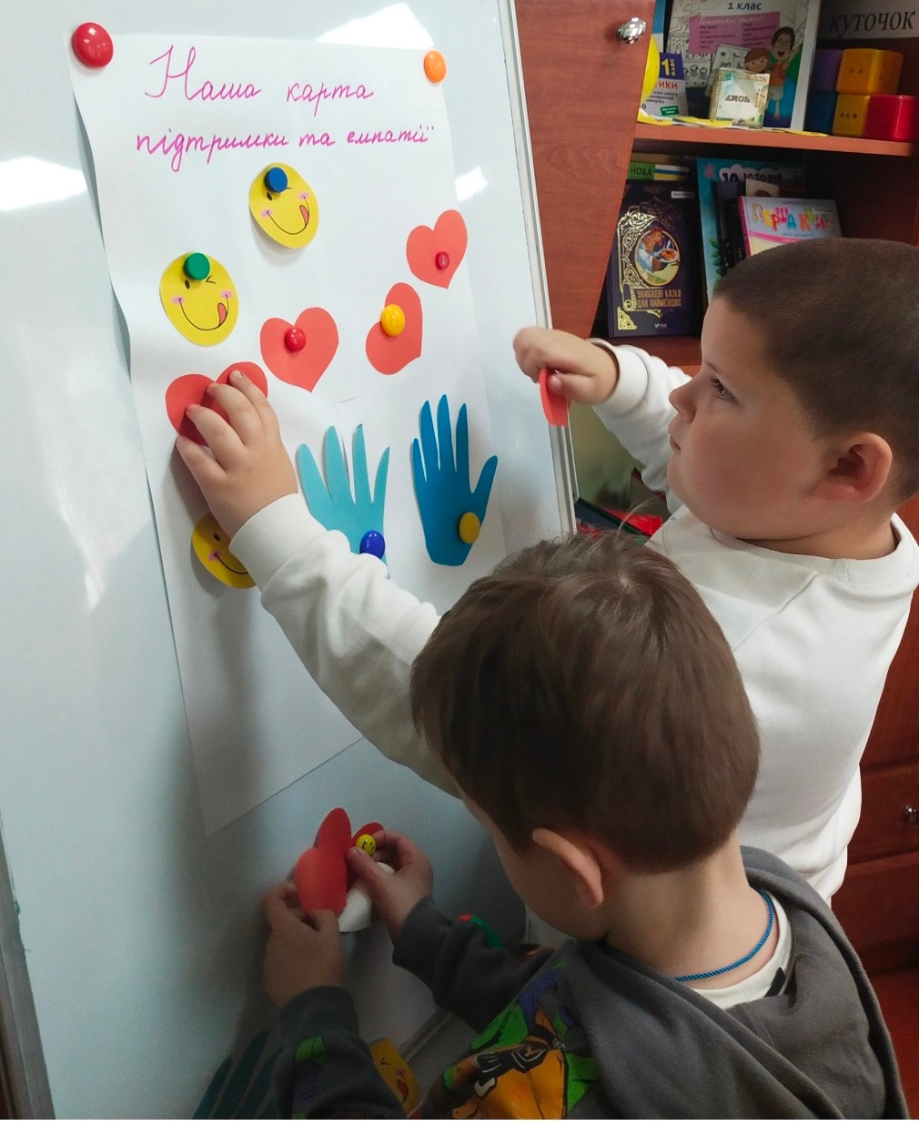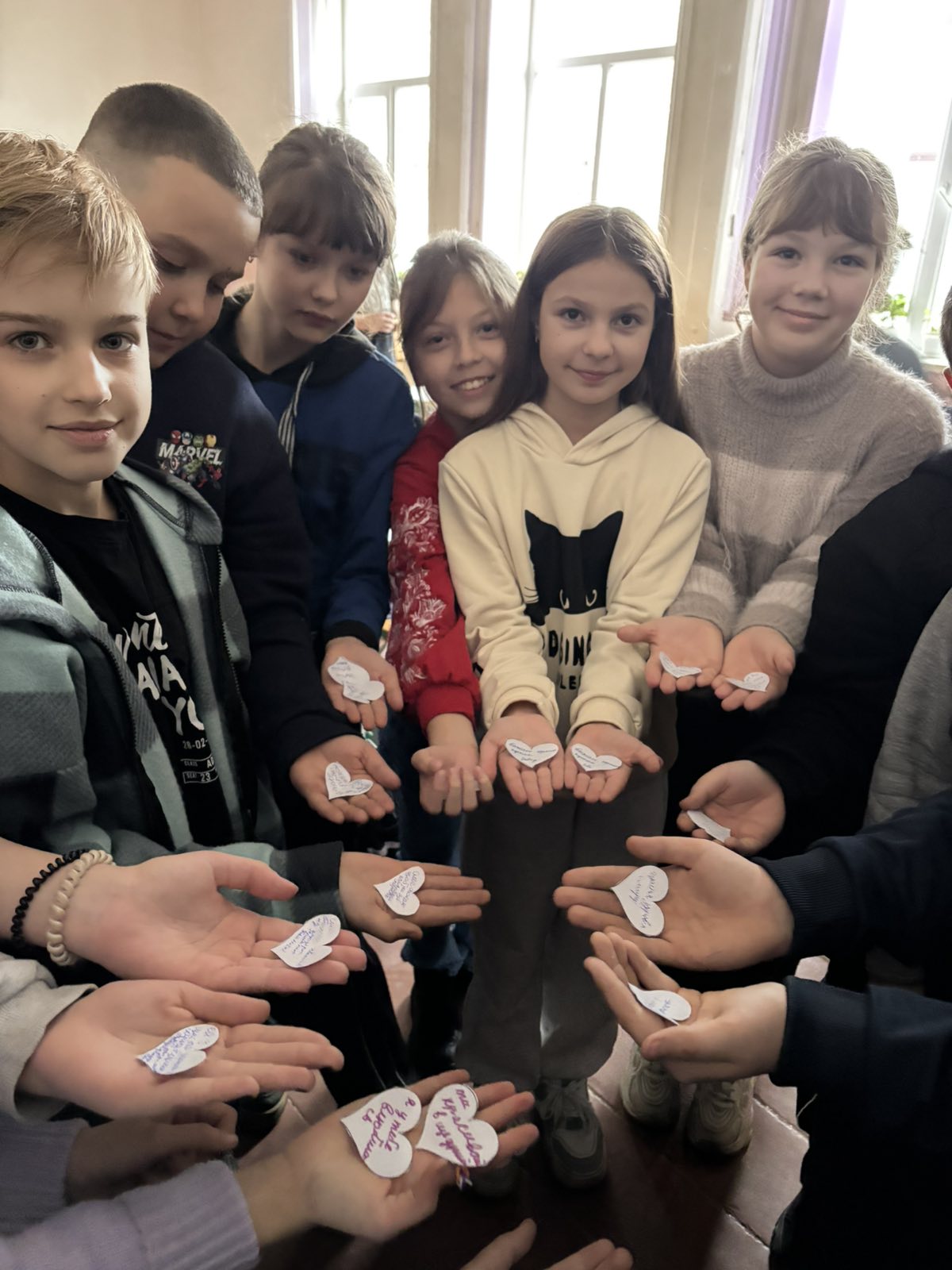 Під час уроку діти брали участь у вправах на розвиток доброти й довіри, створювали «коло підтримки» та складали словесні дотики, які здатні зігріти серце кожного.